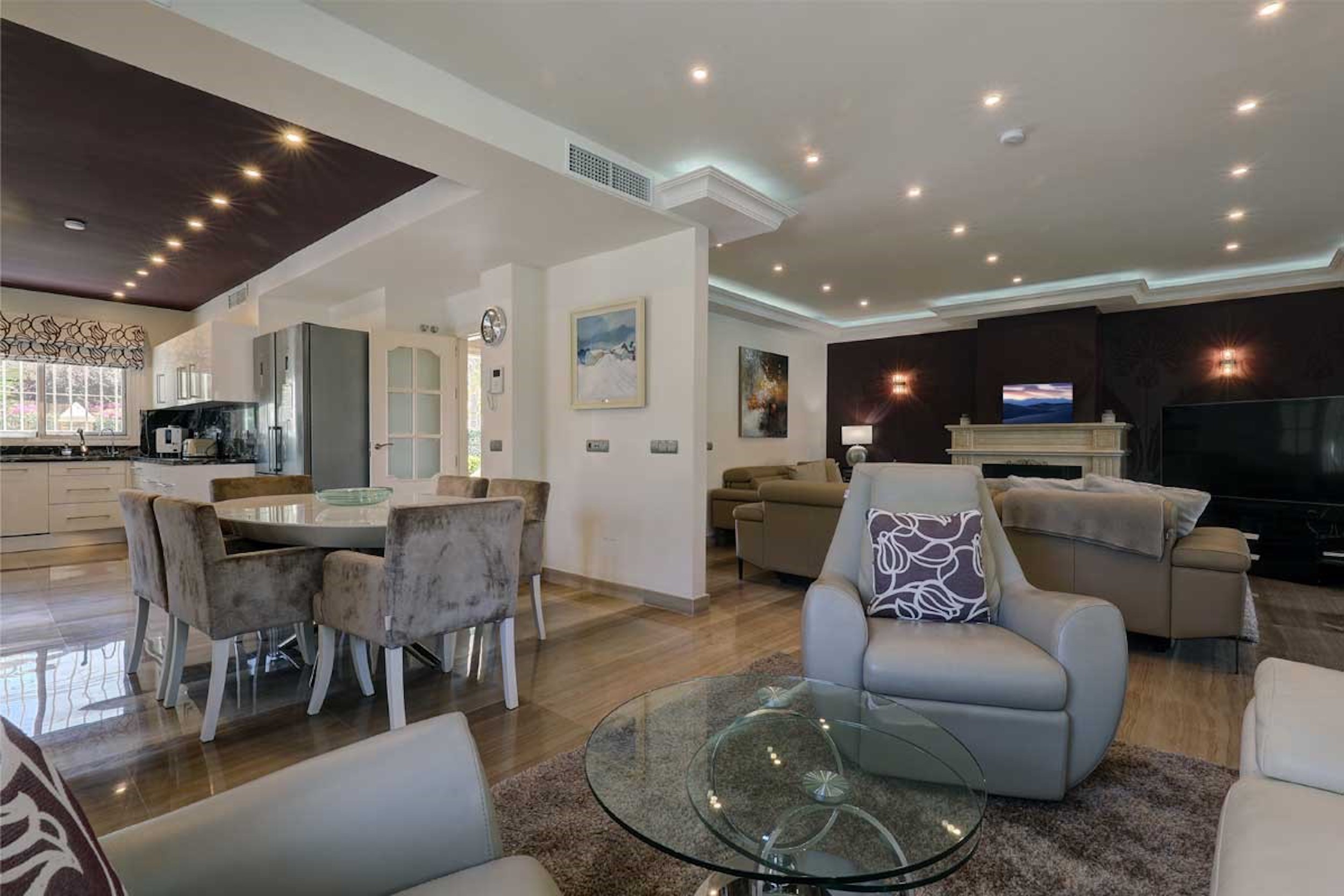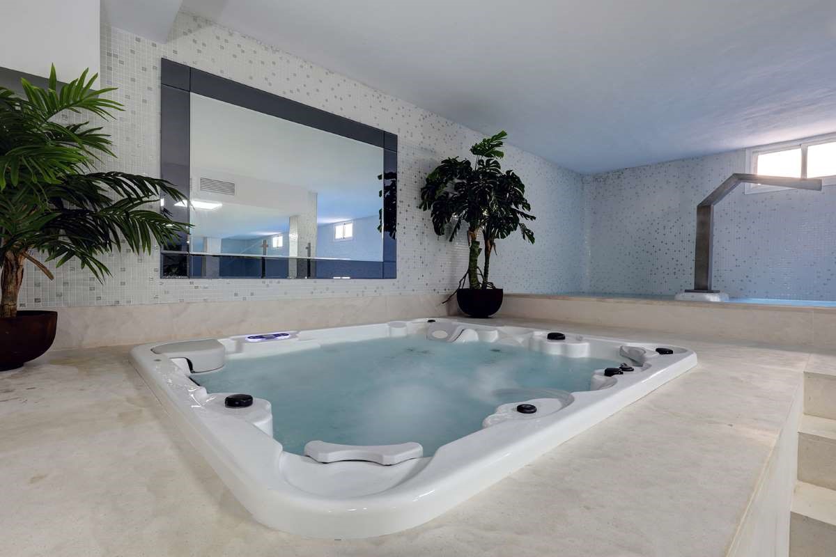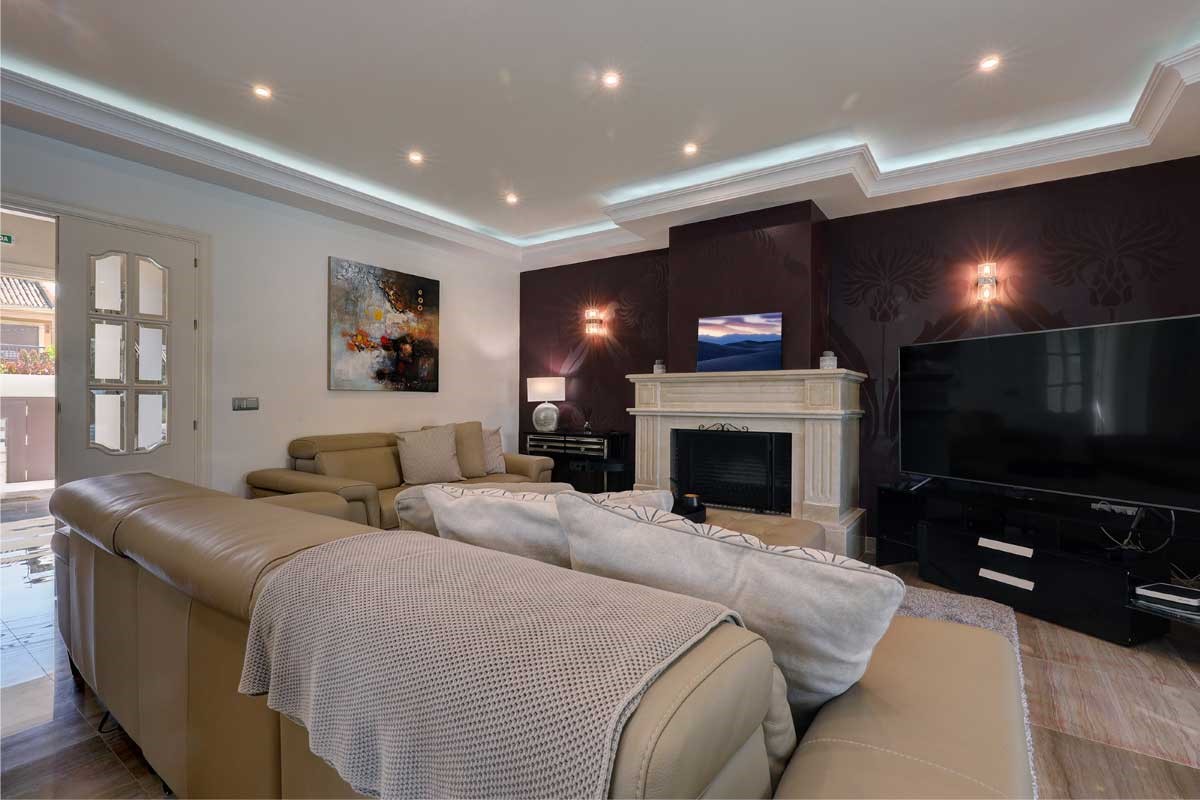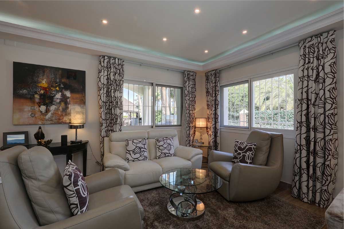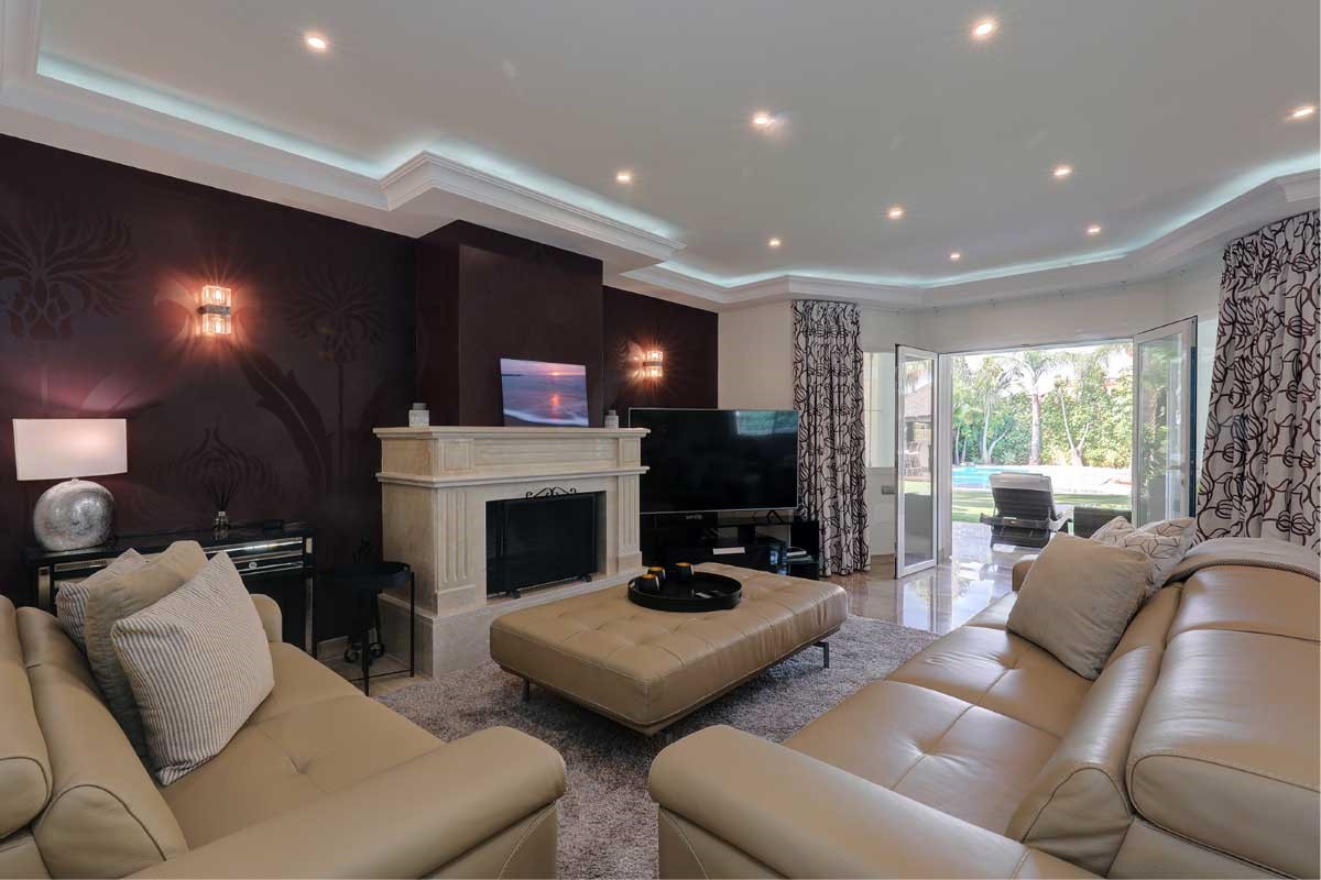 Stunning 6 bedroom detached villa with private heated pool and indoor pool. Located in Cortijo Blanco, San Pedro de Alcantara. The front door opens to a grand entrance with high ceilings and views through the living room to the garden. There is also a guest toilet in the entrance hall.