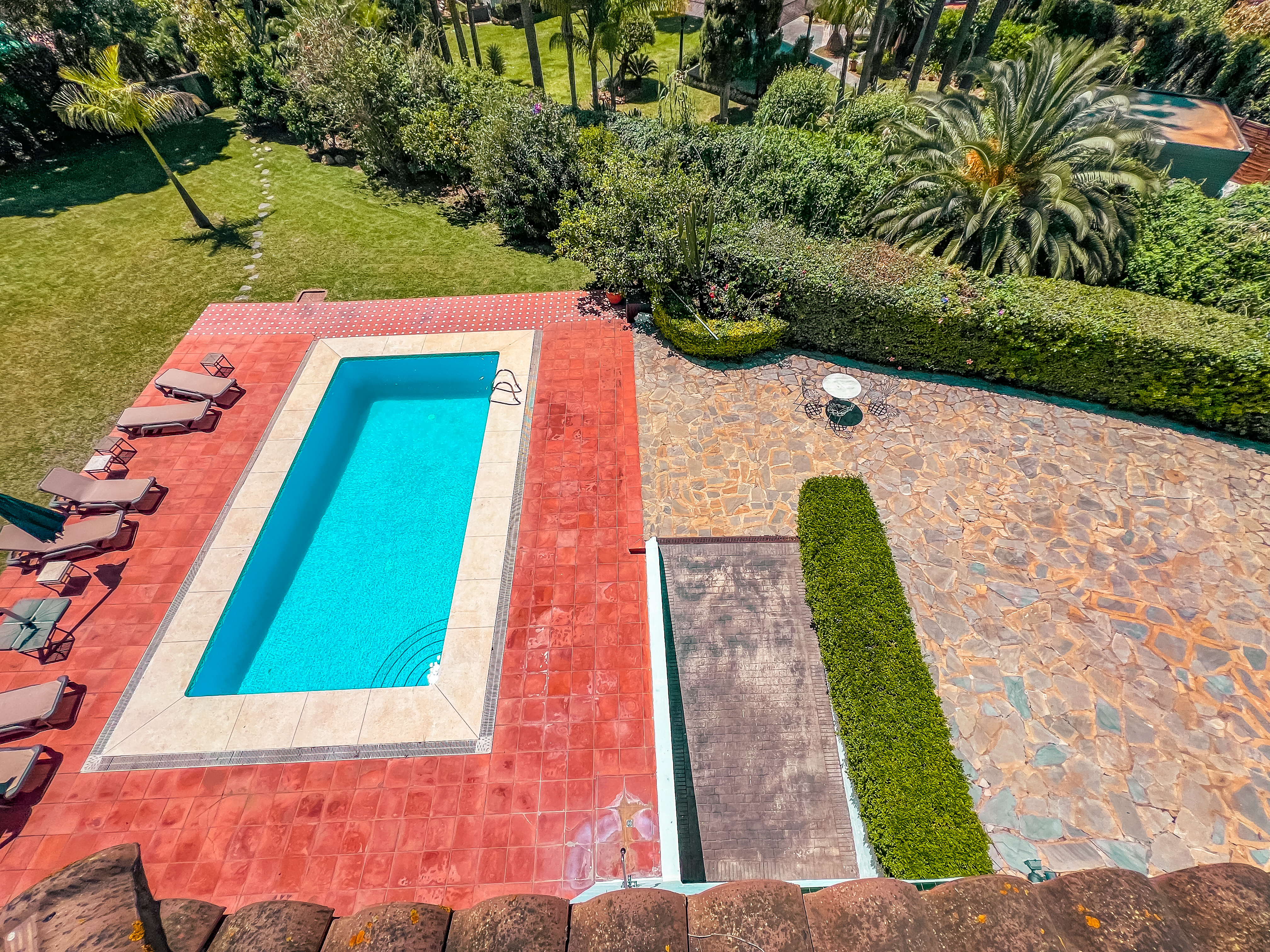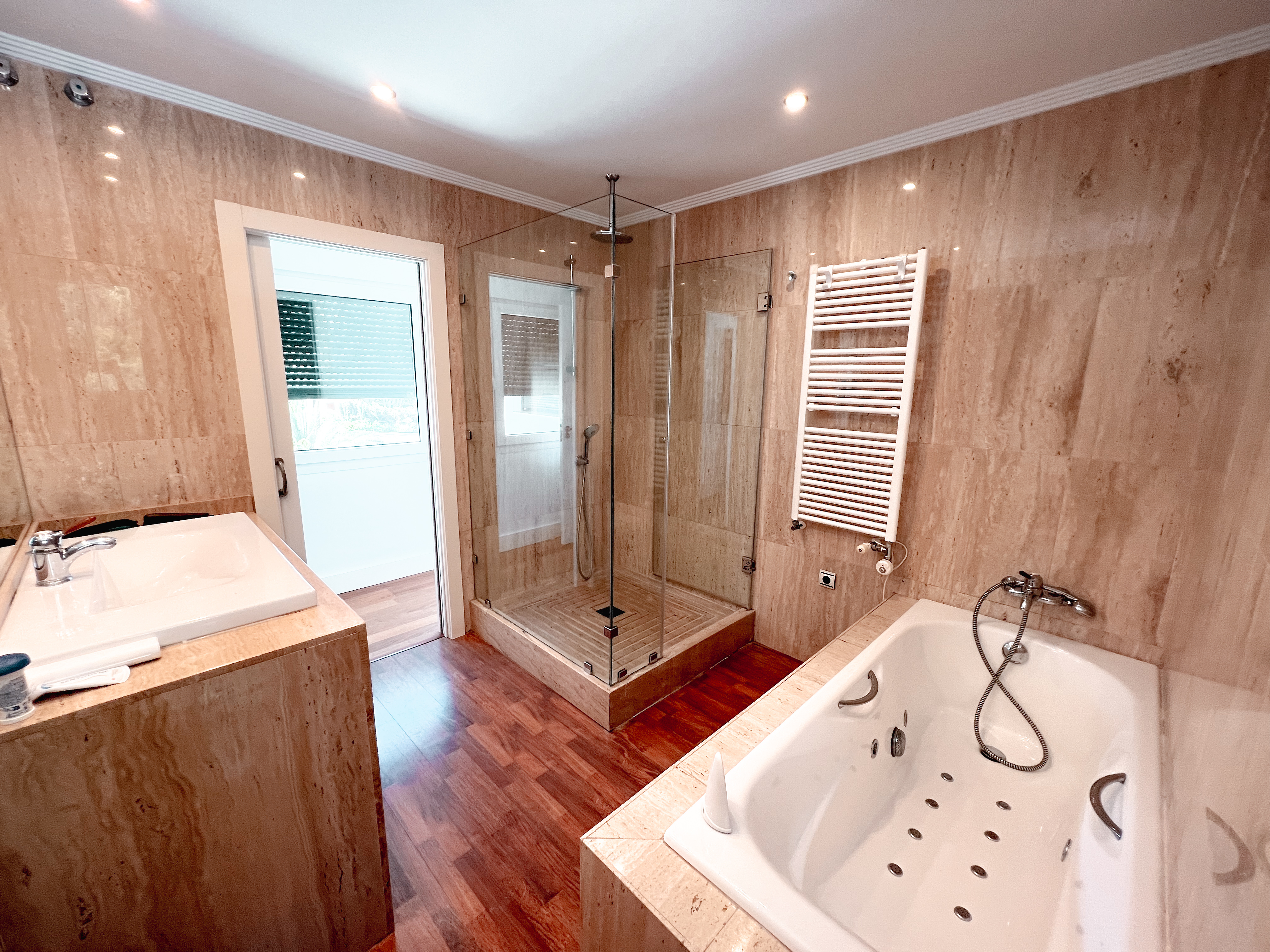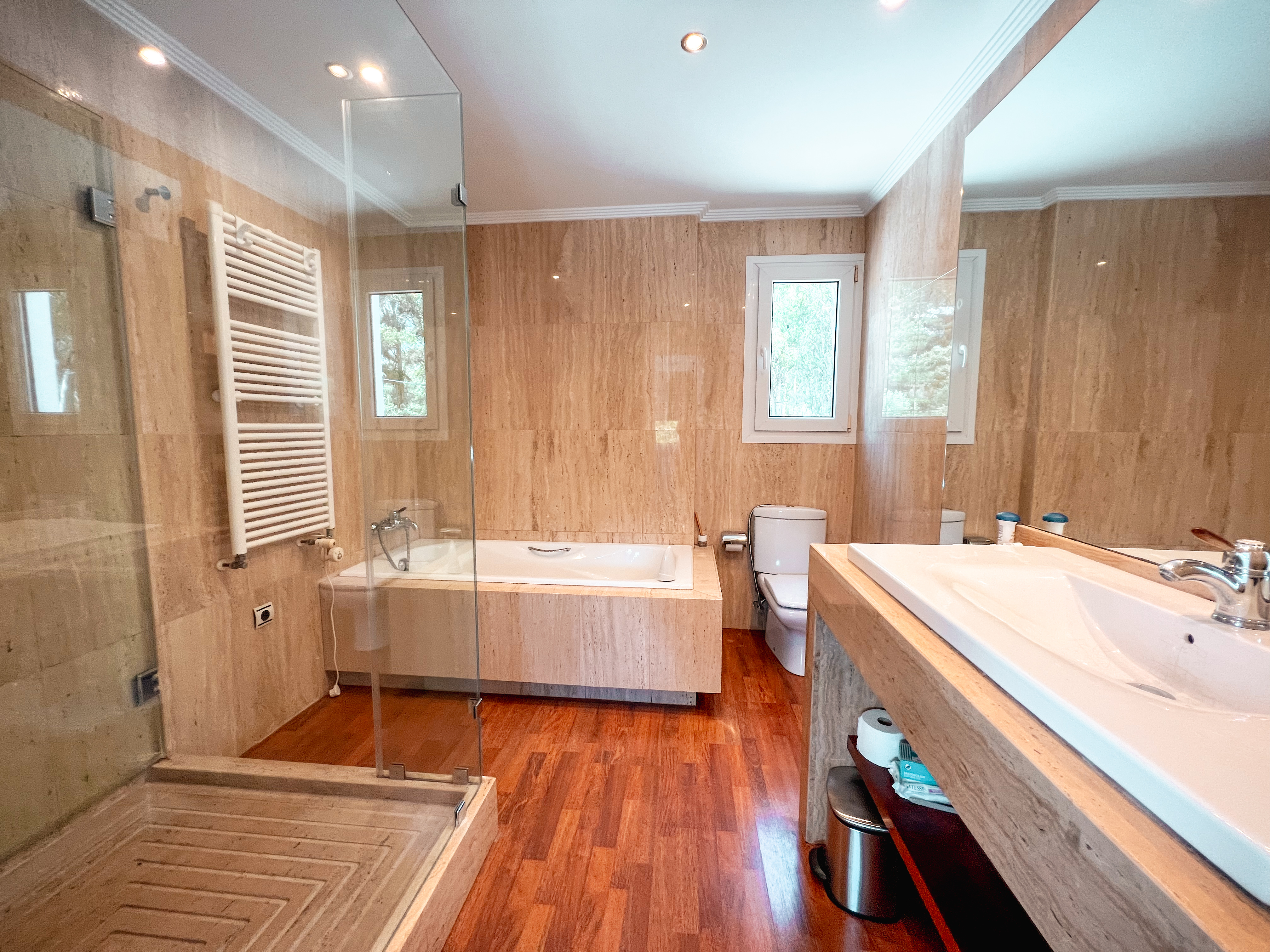 The villa has air conditioning in all bedrooms except the ground floor room where there is a ceiling fan with a remote control and in the attic where the double sofa bed is located, which has a standing air conditioner. What makes this villa special is undoubtedly its outdoor space where large groups such as families or friends can enjoy, as it has a large garden, a 10 x 4 mt private pool that has an outdoor shower with hot water, 6 sun loungers with 2 large parasols, its covered terrace with comfortable sofas and table to eat al fresco for up to 10 people, and its basket to play basketball. Also the villa has an alarm system, and uncovered parking inside the property for about 3 cars.
