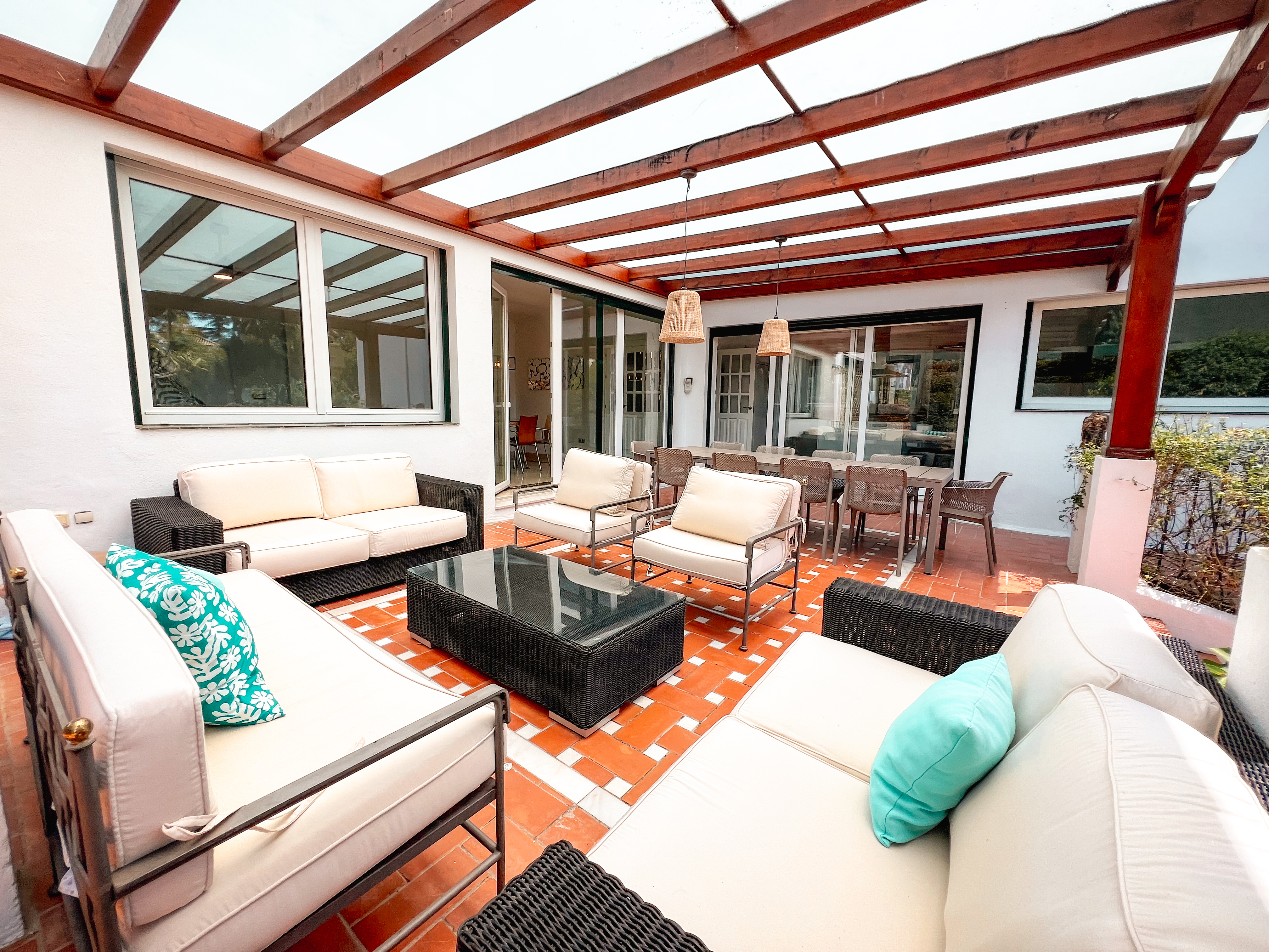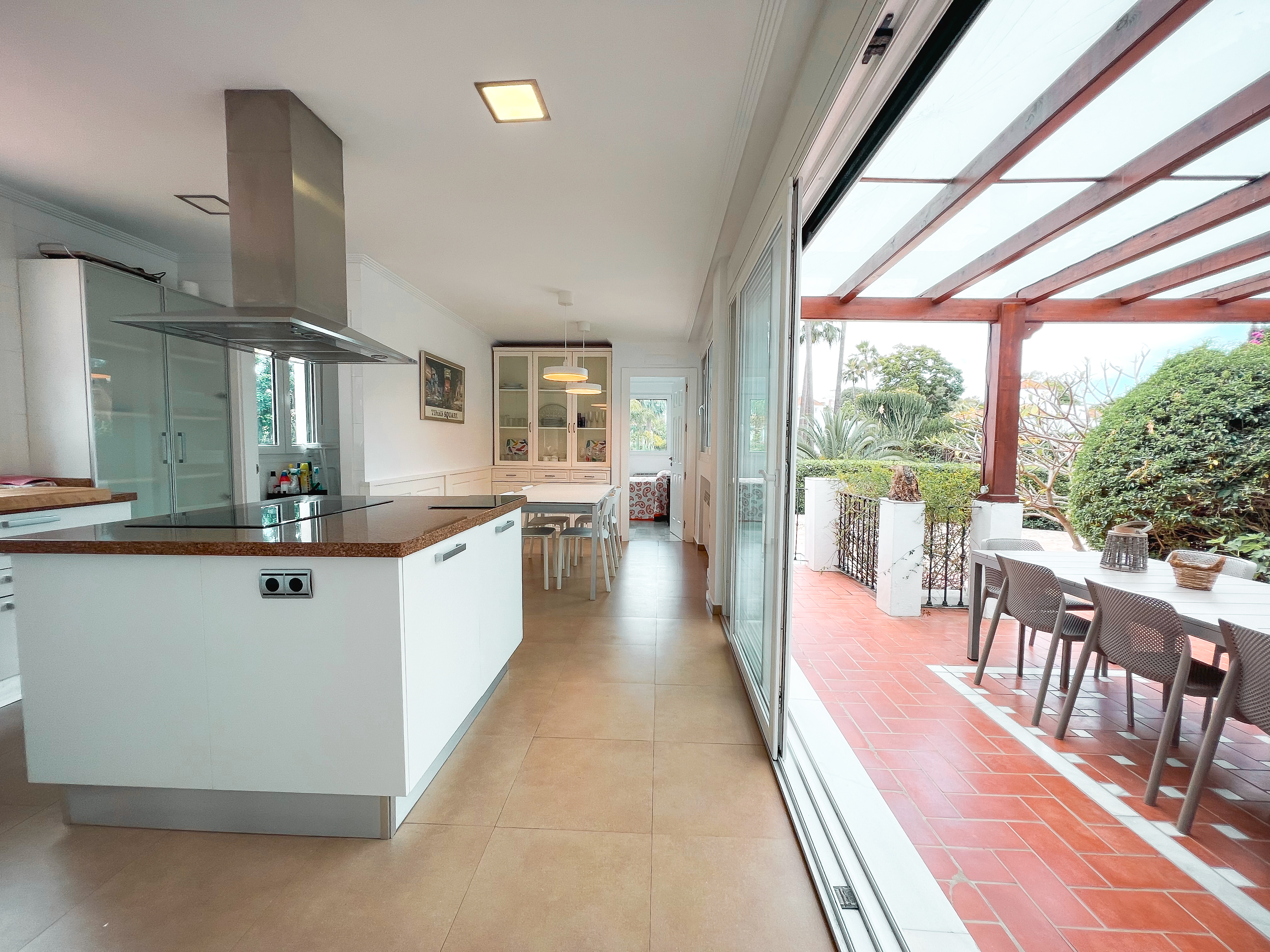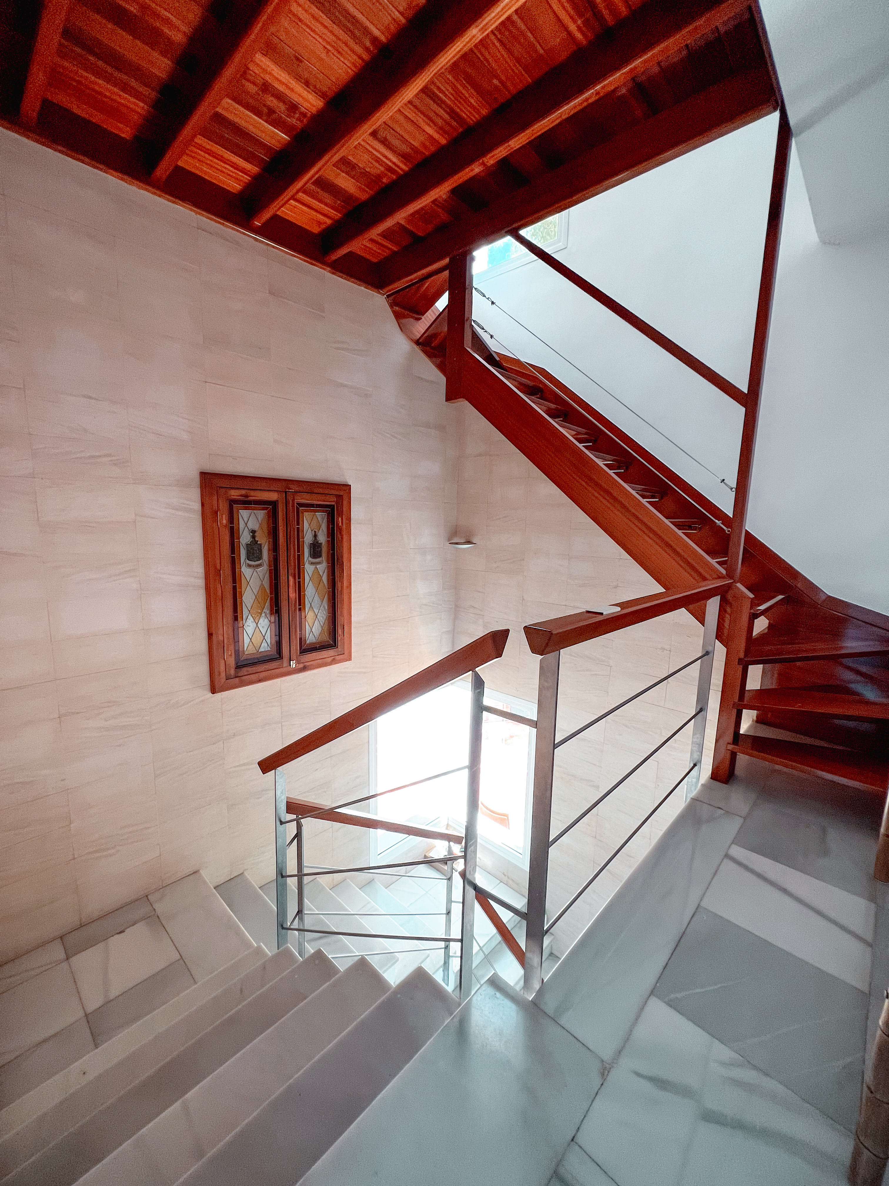 The villa has air conditioning in all bedrooms except the ground floor room where there is a ceiling fan with a remote control and in the attic where the double sofa bed is located, which has a standing air conditioner. What makes this villa special is undoubtedly its outdoor space where large groups such as families or friends can enjoy, as it has a large garden, a 10 x 4 mt private pool that has an outdoor shower with hot water, 6 sun loungers with 2 large parasols, its covered terrace with comfortable sofas and table to eat al fresco for up to 10 people, and its basket to play basketball. Also the villa has an alarm system, and uncovered parking inside the property for about 3 cars.