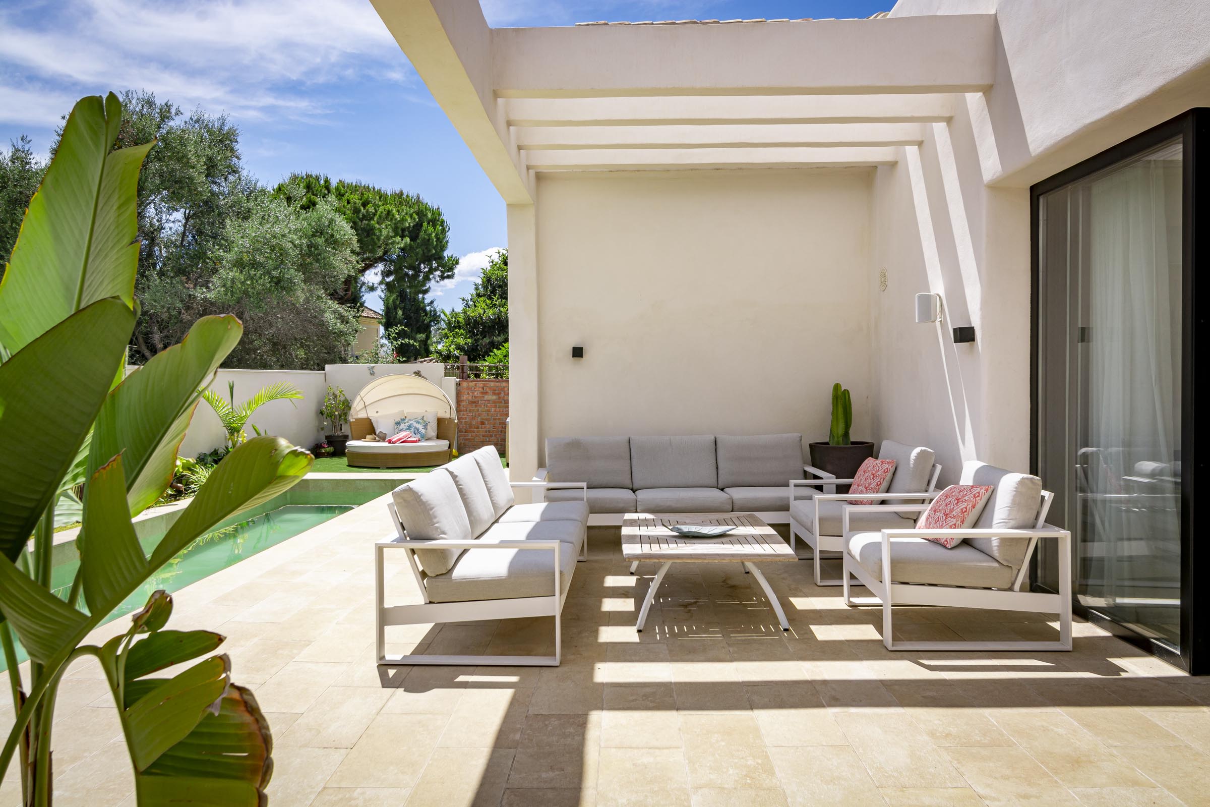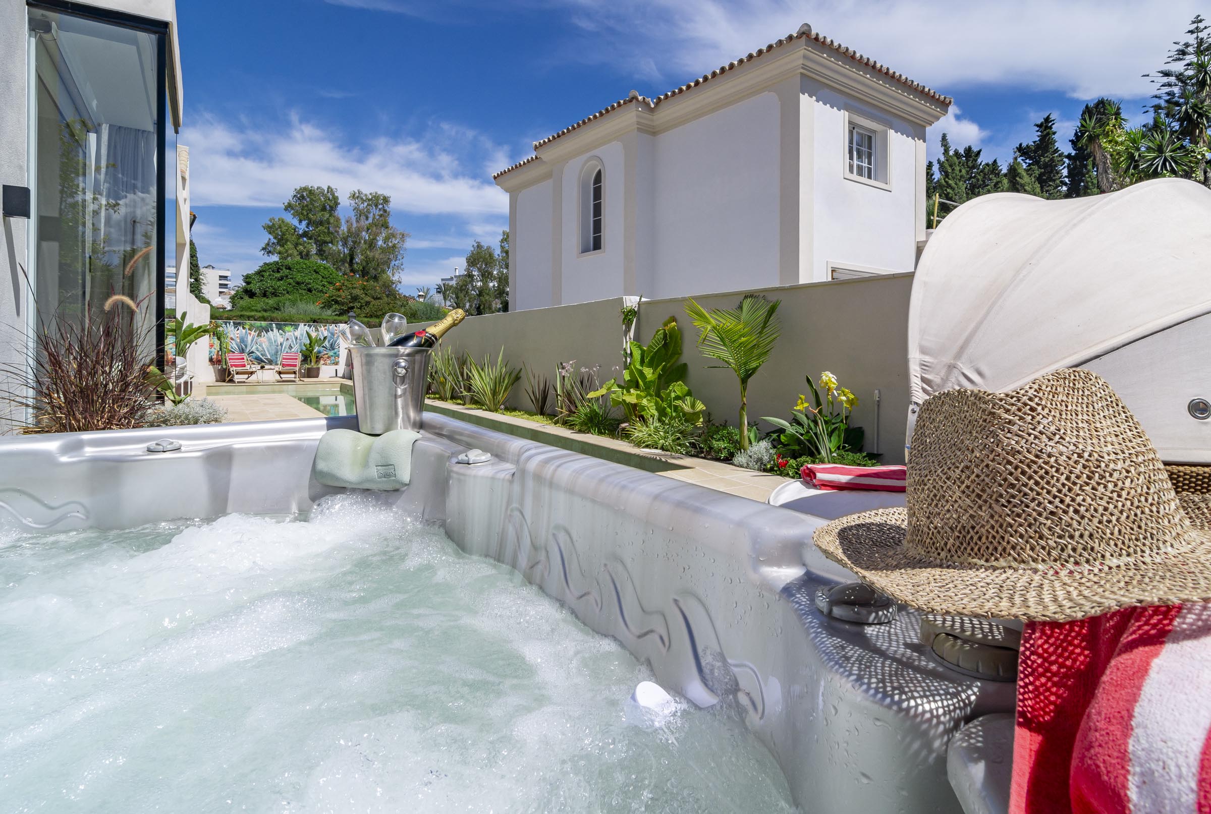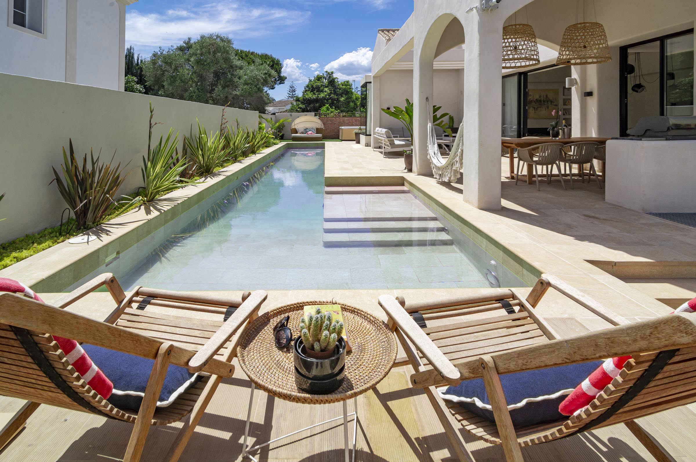With over 300m of outdoor space, creating the finest combination between soft and natural colours and classic Andalucian architecture. There is a wide variety of sunbeds, a hammock, seating areas and dining facilities, all surrounding the saltwater pool and jacuzzi.
