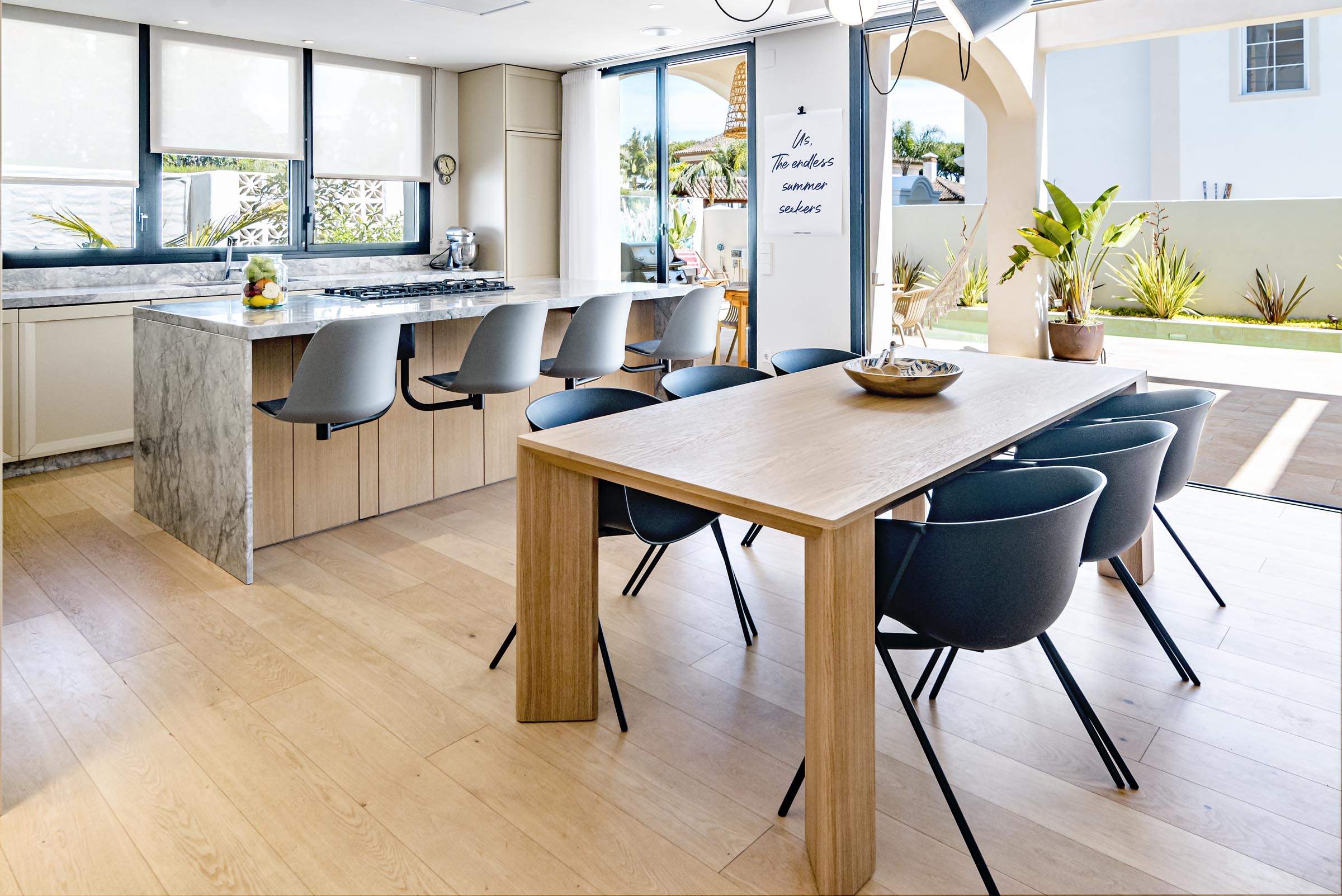 The open-plan living/kitchen area is the perfect space to enjoy. The kitchen is fully equipped with high-end appliances. The lounge has a large Smart TV. This space leads onto the terrace and pool area.