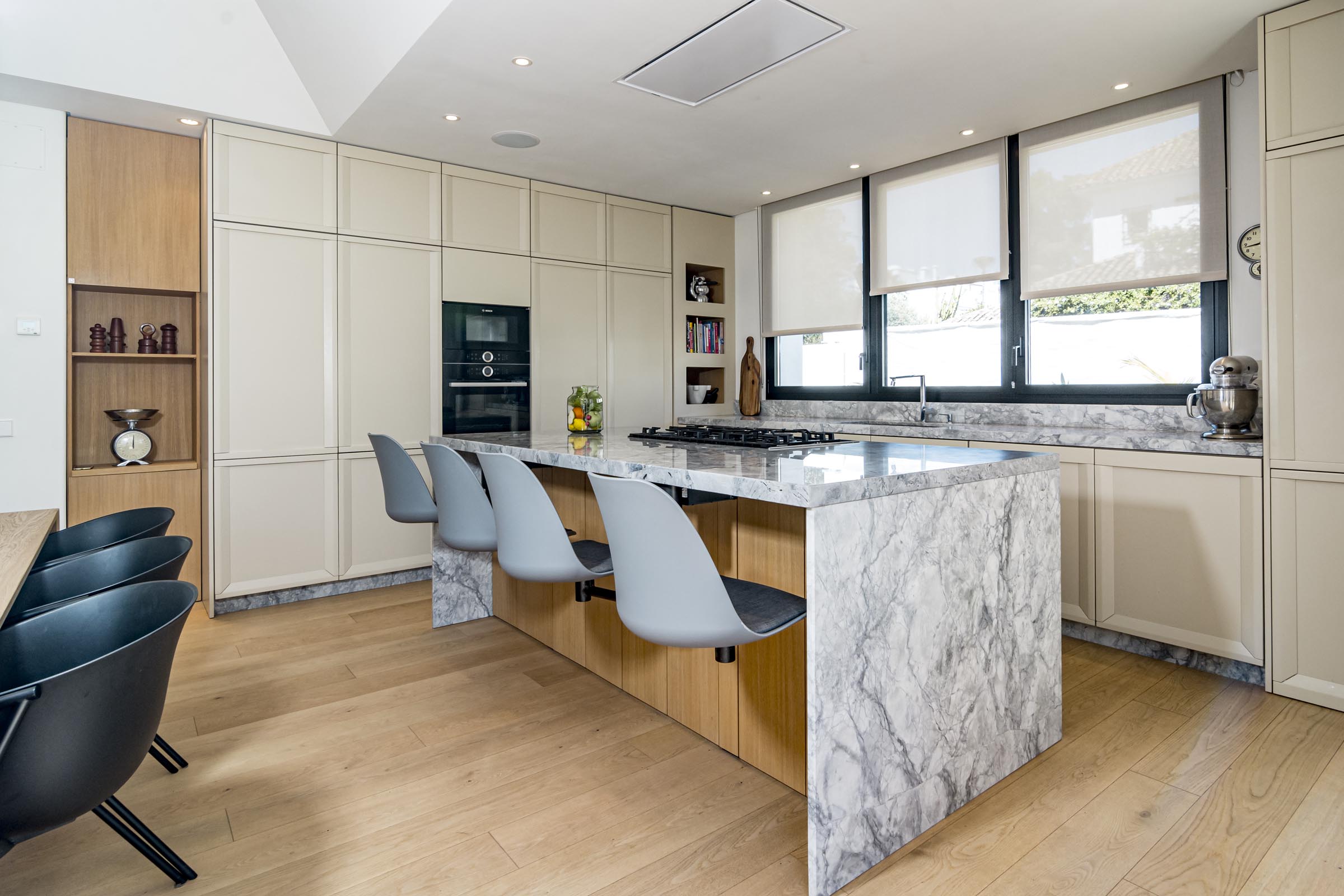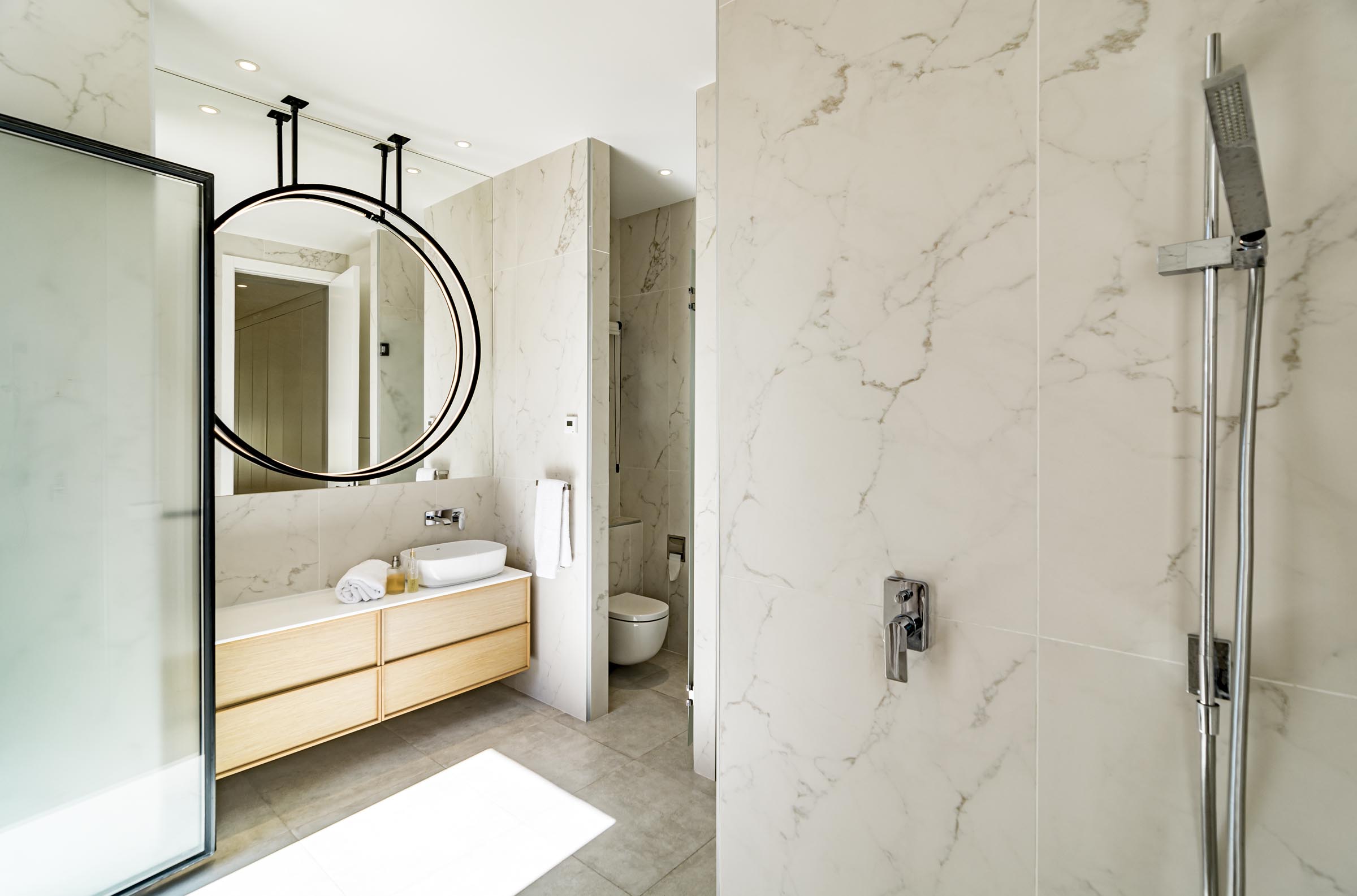The Master Suite is on the ground floor. 2 further bedrooms are upstairs. These three bedroom suites have air conditioning and underfloor heating, wooden flooring and bespoke cabinetry.
