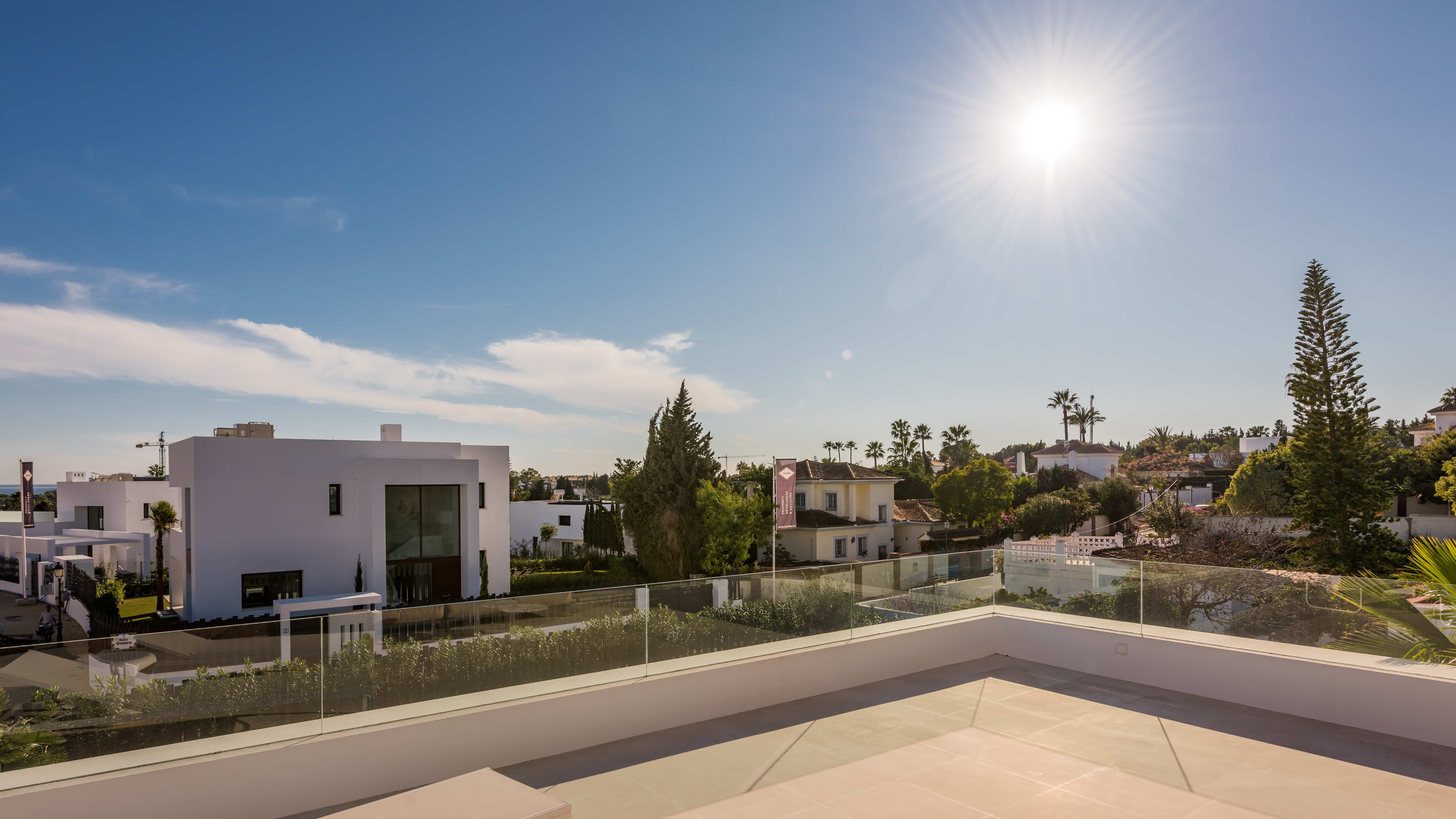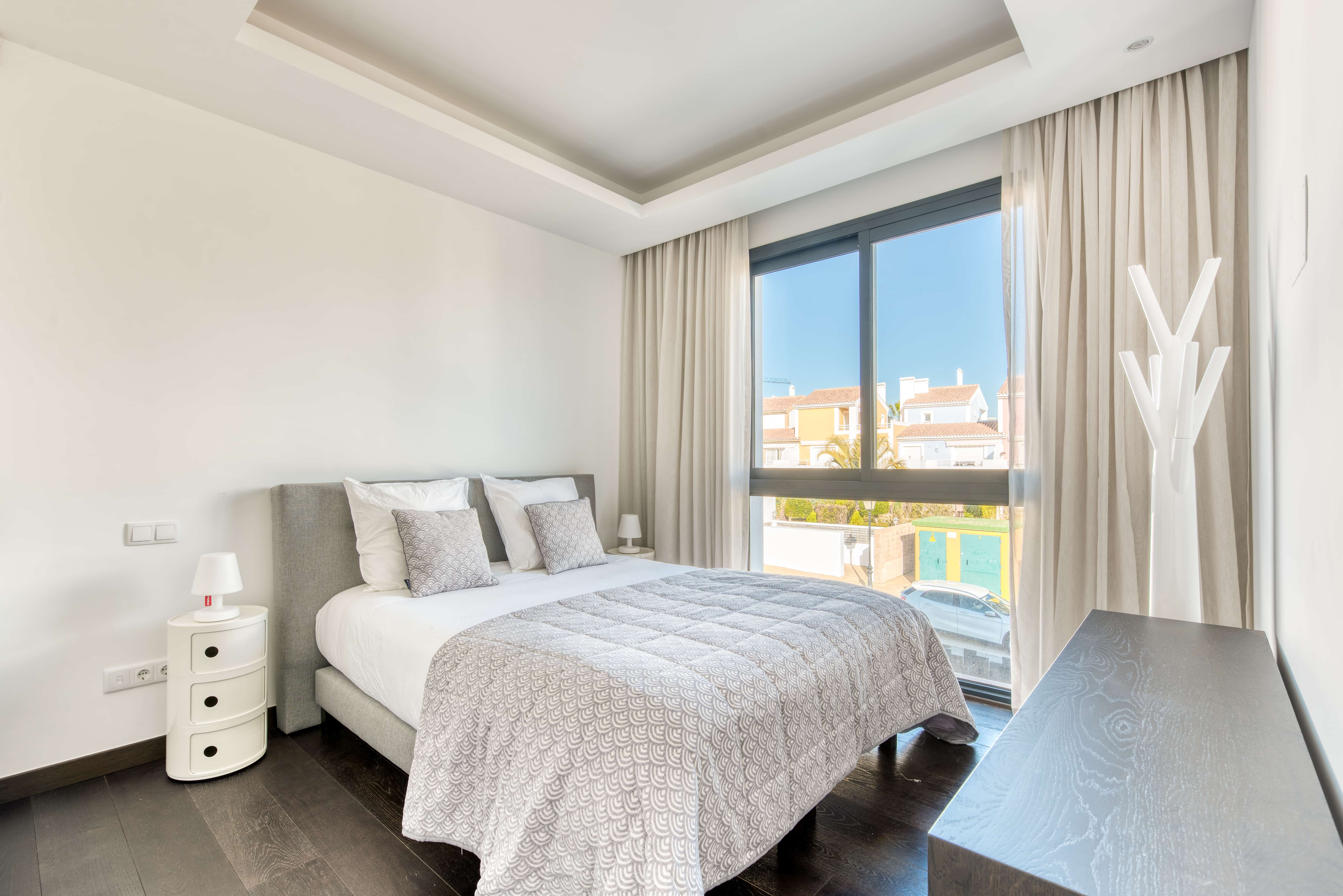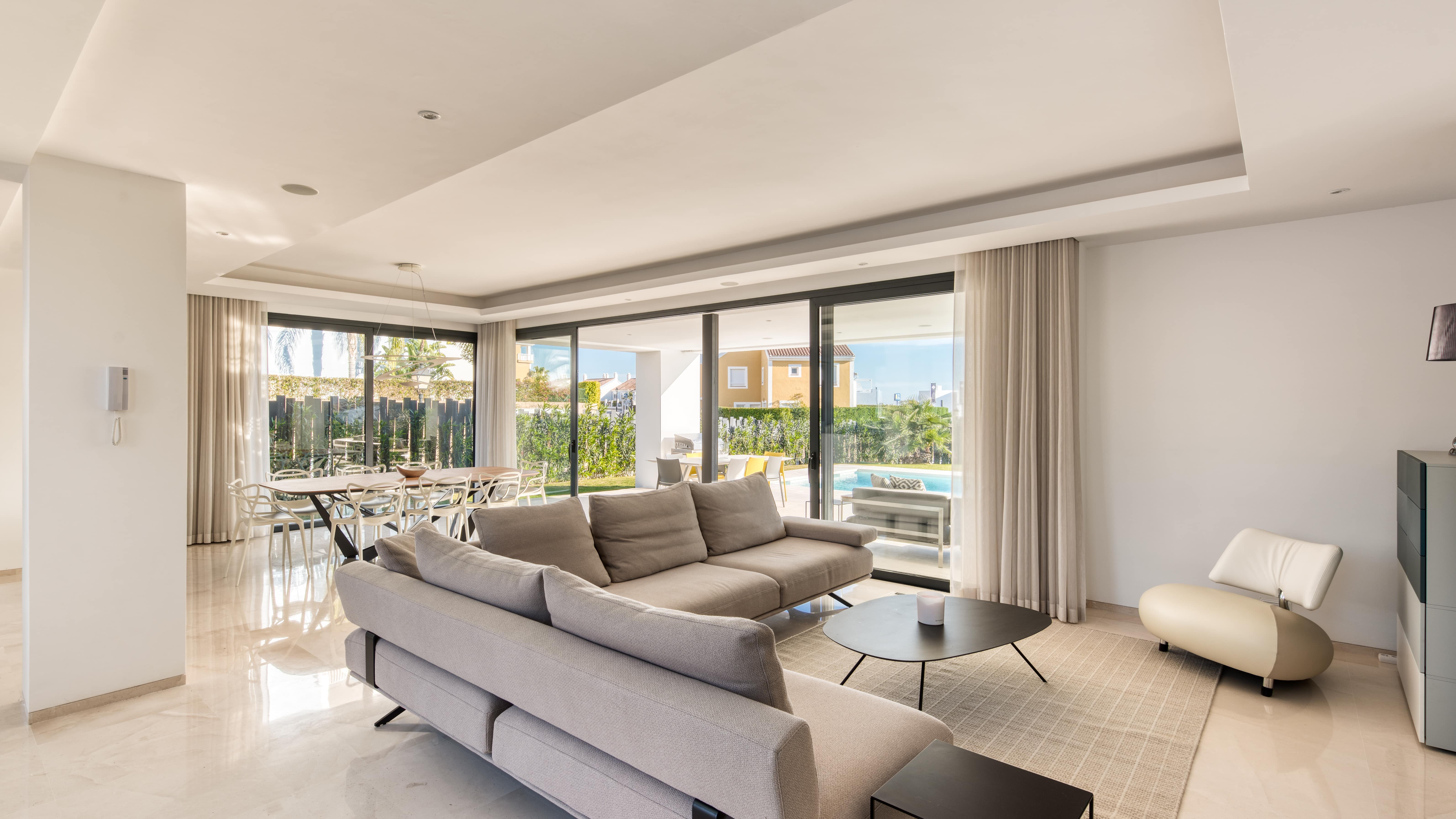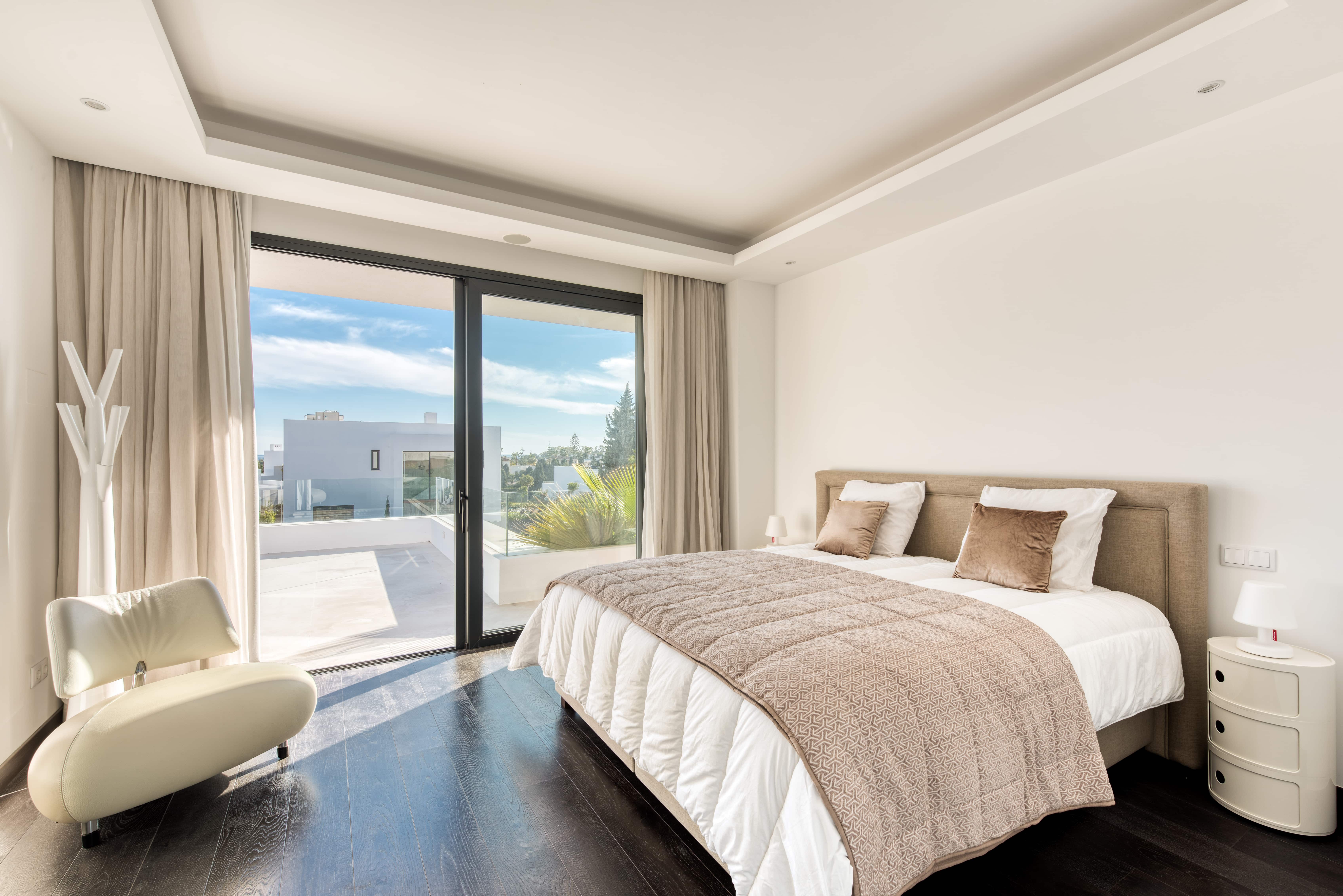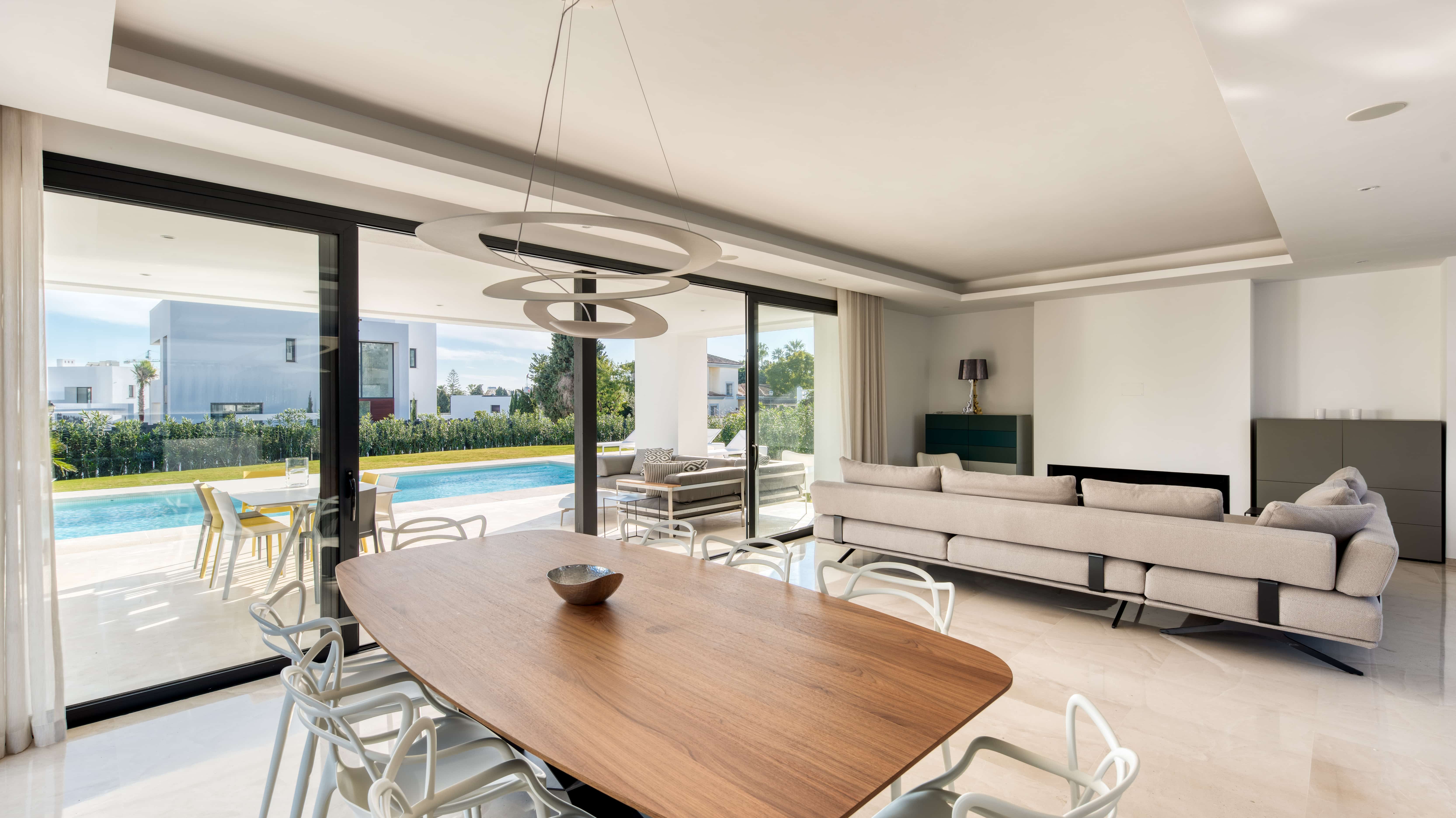 Villa for rent in Estepona with 5 bedrooms, 5 bathrooms, 5 en suite bathrooms and with orientation south, with private swimming pool, private garage and private garden. Regarding property dimensions, it has 570 m2 built, 1,060 m2 plot, 370 m2 interior and 200 m2 terrace. Has the following facilities pool view, close to golf, amenities near, close to shops, excellent condition, air conditioning, glass doors, marble floors, basement, private terrace, dining room, laundry room, living room and fully fitted kitchen.