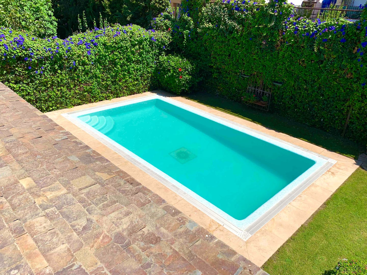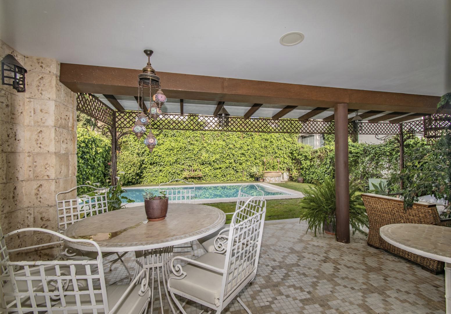 It has 4 bedrooms and 3 bathrooms, a living room with a large dining area, a full kitchen, a terrace area with several sofas and a table, a garden and a nice private pool.